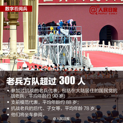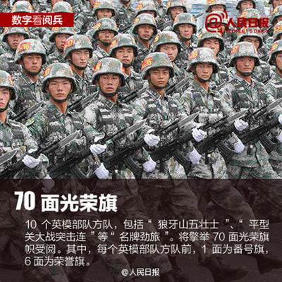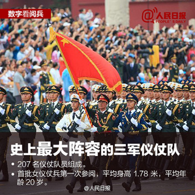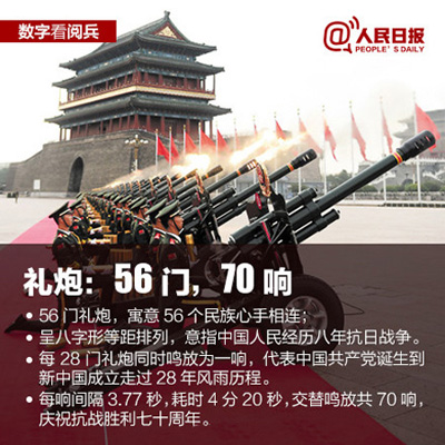 ①56门礼炮,寓意56个民族,交替鸣放70响,庆祝抗战胜利七十周年;②共编50个方队,参阅总兵力超过一万人;③装备500多台,各型飞机近200架,84%是首次亮相;④三军仪仗队由207人组成,为史上最大阵容;⑤50余名将军将受阅,最高军衔是中将。