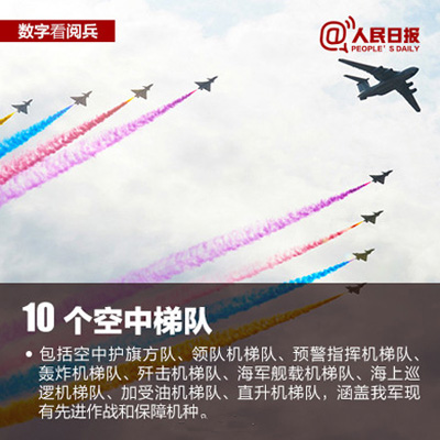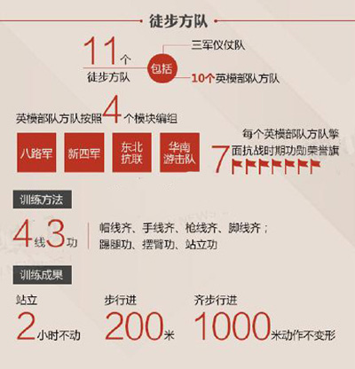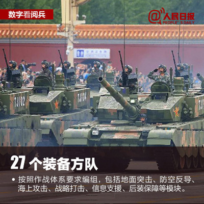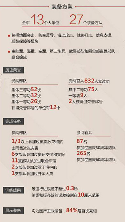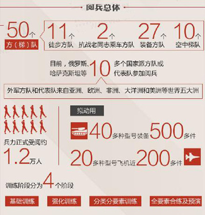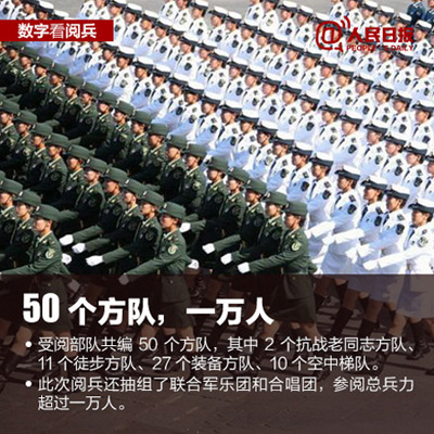 50个方(梯)队,11个徒步方队,27个装备方队,10个空中梯队等。
