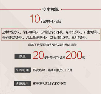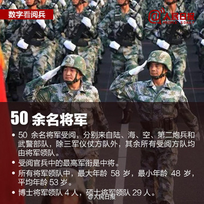 ①将有50余名将军受阅,分别来自陆、海、空、第二炮兵和武警部队,除三军仪仗方队外,其余所有受阅方队均由将军领队。②最大年龄58岁,最小年龄48岁,平均年龄53岁;③最高军衔是中将;④高学历:博士将军领队4人,硕士29人。